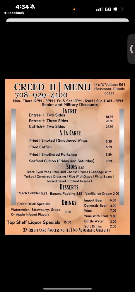 Welcome to CREED-Flossmoor, the ultimate destination for lovers of authentic African American cuisine! Nestled at 3331 Vollmer Rd, Flossmoor, IL, we specialize in mouthwatering smoked wings and offer a delightful range of dishes that highlight local flavors. Enjoy our dynamic atmosphere featuring live concerts and indulge in our delectable desserts. With accessible dining options, speedy service, and a variety of drinks—including cocktails, beer, and wine—CREED is perfect for lunch, dinner, or a casual solo meal. Our Black-owned restaurant also provides takeout, delivery, and outdoor seating, ensuring a wonderful dining experience for all.