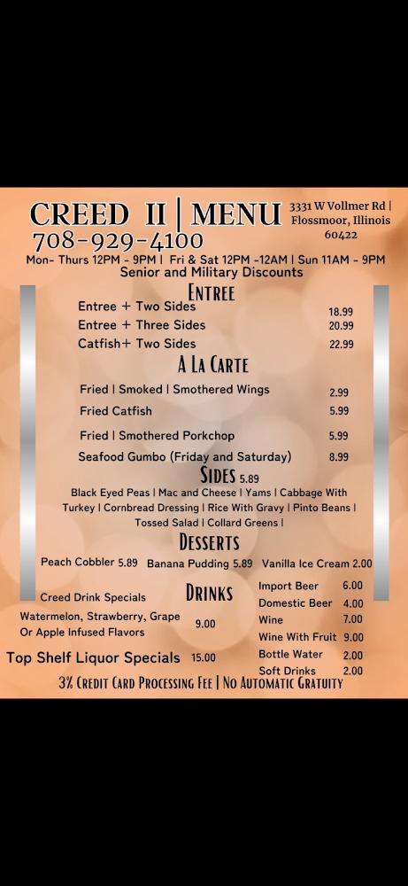The menu at CREED-Flossmoor showcases a mix of Afro-American specialties. Signature dishes include smoked wings and smothered chicken, each prepared with care and traditional methods.
